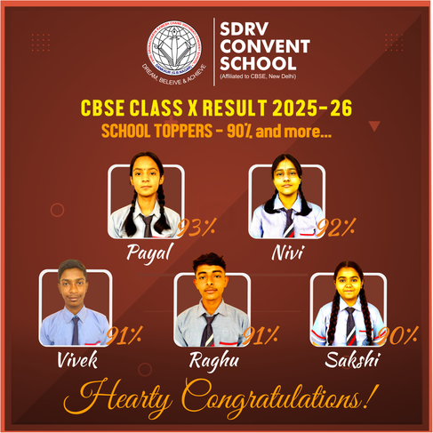 On 15-04-2026, the Class 10 results of the CBSE Board were announced. SDRV Convent School once again achieved a 100% pass result, continuing its tradition of excellence.